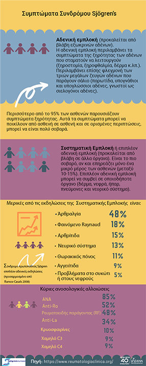 Το Σύνδρομο Sjögren είναι μία αυτοάνοση νόσος, στην οποία το ανοσοποιητικό σύστημα του οργανισμού δεν λειτουργεί φυσιολογικά. Η νόσος δεν έχει συγκεκριμένα συμπτώματα και επηρεάζει διαφορετικά τους ασθενείς. Τα πιο συνηθισμένα συμπτώματα είναι τα στεγνά μάτια (ο ιατρικός όρος είναι «ξηροφθαλμία») ή το στεγνό στόμα (ο ιατρικός όρος είναι «ξηροστομία») ή ορισμένες φορές και τα δύο μαζί. Εκτός από την εκτεταμένη ξηρότητα, άλλες σοβαρές επιπλοκές περιλαμβάνουν τη μεγάλη κόπωση, τον χρόνιο πόνο, την εμπλοκή των κύριων οργάνων, τις νευροπάθειες και τα λεμφώματα.