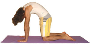 - Με την εκπνοή κυρτώστε την πλάτη σαν θυμωμένη γάτα, ανοίξτε τις ωμοπλάτες, ενώ παράλληλα τραβήχτε τους κοιλιακούς μύες προς τα μέσα και φέρτε το πηγούνι προς το στήθος. Χαλαρώστε τους σφιχτούς μύες στο πάνω μέρος της πλάτης και τον αυχένα, νοιώστε τις ωμοπλάτες να απομακρύνονται και να τεντώνεται το πάνω μέρος της πλάτης ενώ δημιουργείτε μια καμπύλη προς τον ουρανό.